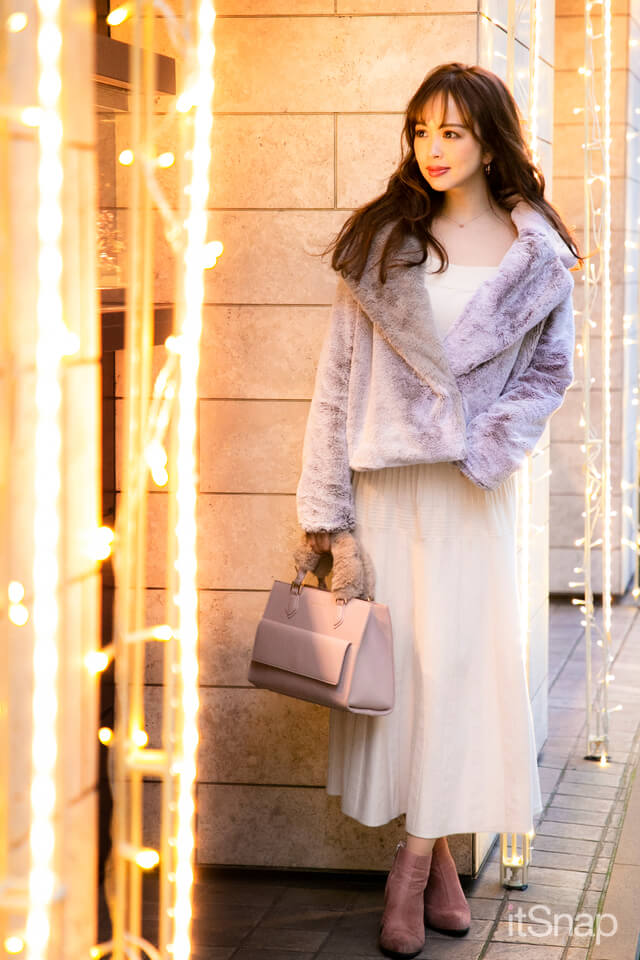 ふわふわで肌触りのいいエコファーはこの冬注目のアウター。ホワイトのロングスカートを合わせてラベンダーカラーの上品な雰囲気を活かした着こなしがGOOD。バッグやシューズもベージュピンクのやさしい色合いを選べば、女性らしいラグジュアリーなコーデが完成♡