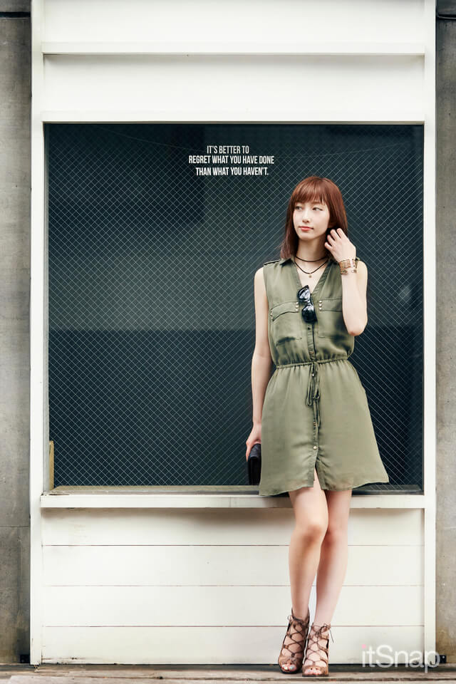 色も素材も違うカーキアイテムを、お腹見せを挟むことで絶妙にMIX!
