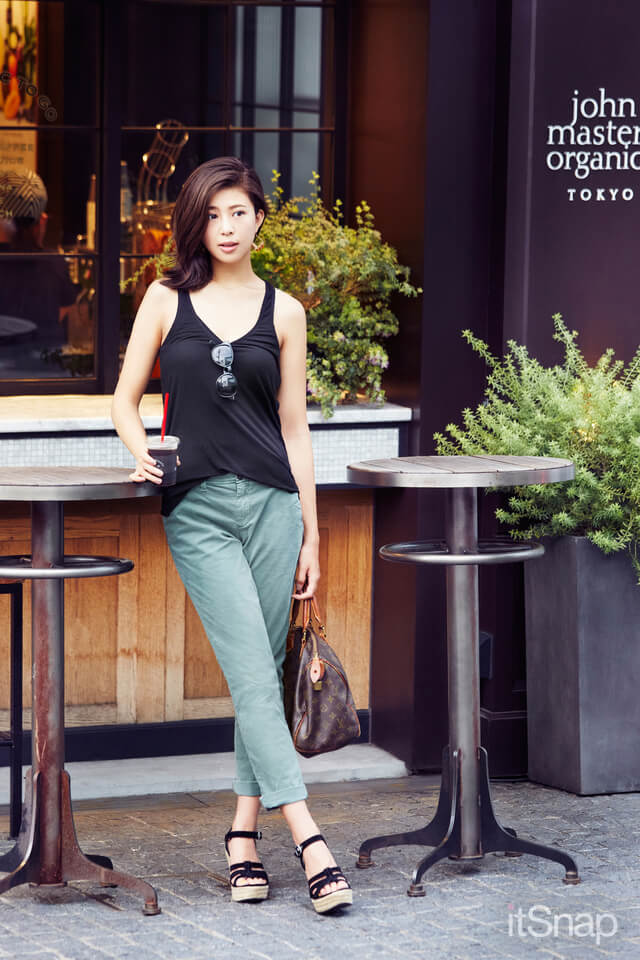 タンク×パンツのカジュアルな組み合わせだからこそ、