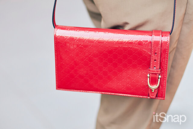 地味になりがちなカーキコーデを光沢感のある赤で艶やかに。
