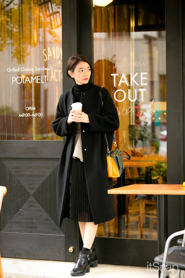 大人っぽいロングのブラックコートに、アクセントとしてベージュのフリルコルセット付きスカートをチョイス。ウエストマークすることでワントーンのコーデもメリハリがでます♪ 足元はショートブーツを合わせて肌見せし、抜け感をプラス。都会的な大人の女性の雰囲気を出したいときは、すっきりとしたワントンコーデに挑戦してみて♡
