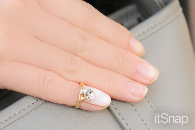 ガーリー好きな女の子にオススメしたいのが、ベビーピンクにパールが付いたネイルリング。ホワイトのコートやふわふわファーバッグと相性抜群です♡ お仕事柄ネイルをすることができない人でも、気軽に指先のオシャレを楽しむことができるのがスタンプネイルリングの嬉しいポイント。気分に合わせて付け替えて♡