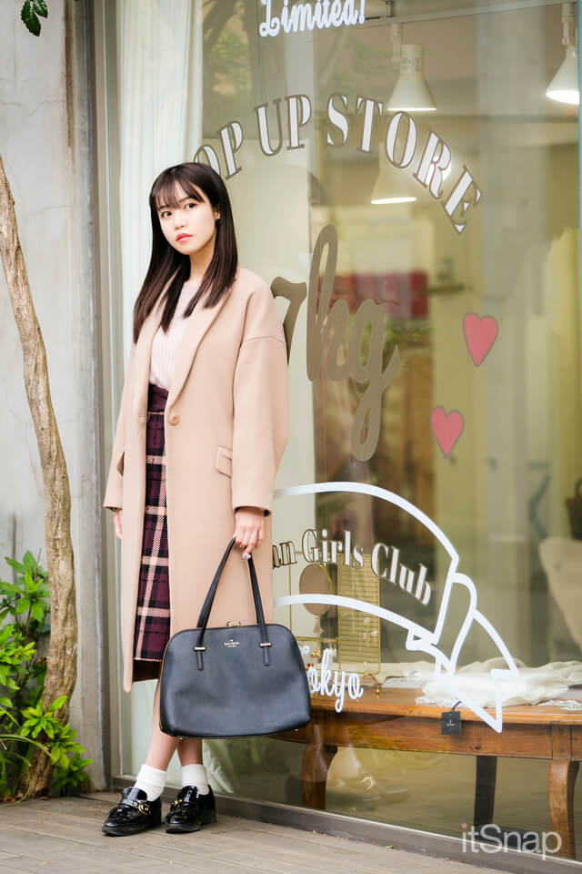 クラシカルな膝下ロングのコートと丈を合わせたチェックスカートで着ぶくれ知らずのIラインコーデ。チョコレートカラーのワントーンに、アクセントとしてターコイズのネイルリングをセレクト。アンティーク感あるゴールドのチェーンがこなれた印象をプラスします♡