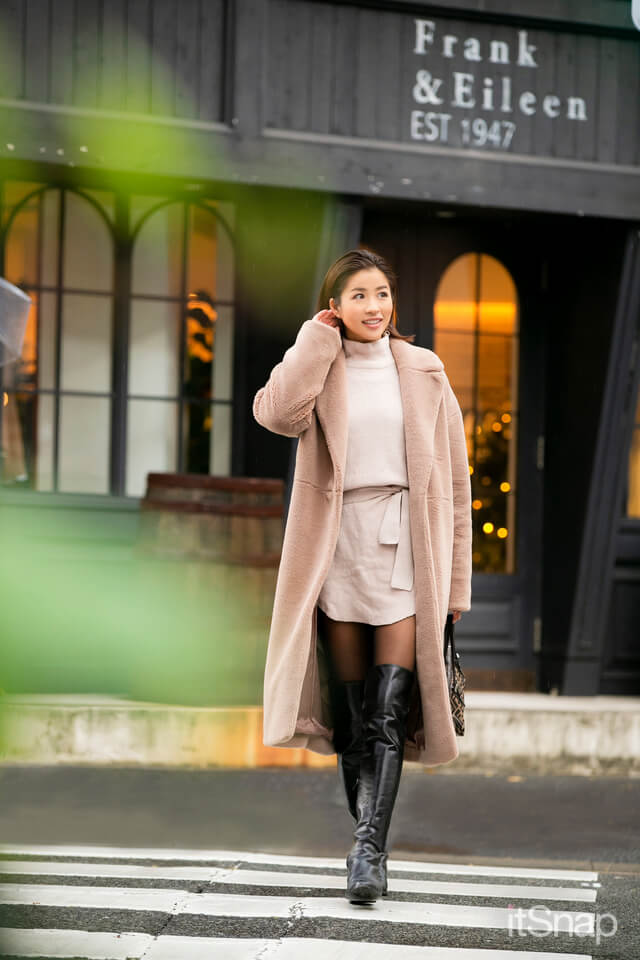 ロングコートも女性らしいピンクなら重たくならないから◎。Ungridのこのコートは、思わず触れたくなる肌触りのいいファーがポイントです♪ その中に同色系のSABO SKIRTのニットワンピを着て、甘さを前面に出しながら、足元はZARAのニーハイブーツで絶対領域を見せすることで、ドキッとさせるギャップを演出して♡