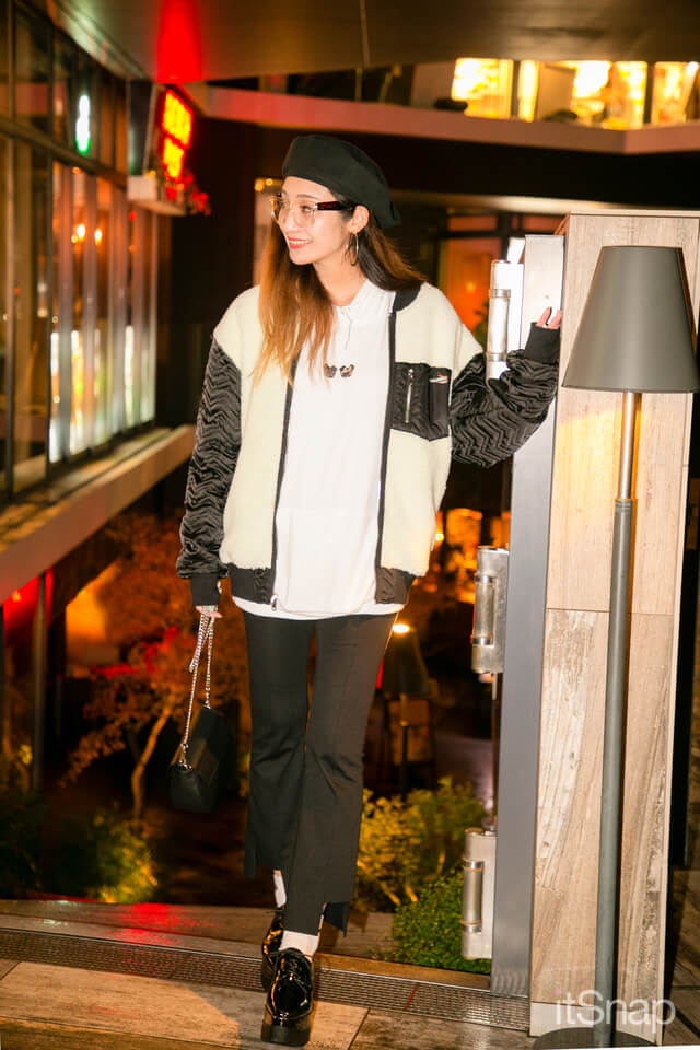 KAWI JAMELEのリバーシブルで使えるボアアウターは、袖やポケットの切り替えデザインが新鮮! 一枚羽織れば洗練された印象になるので、あえてシンプルなフレアパンツを合わせてスタイリッシュにまとめるのがコーデのミソです♪ ベレー帽×サングラスのちょっぴりヤンチャな小物遣いがストリート感を上乗せして、よりおしゃれな印象に☆