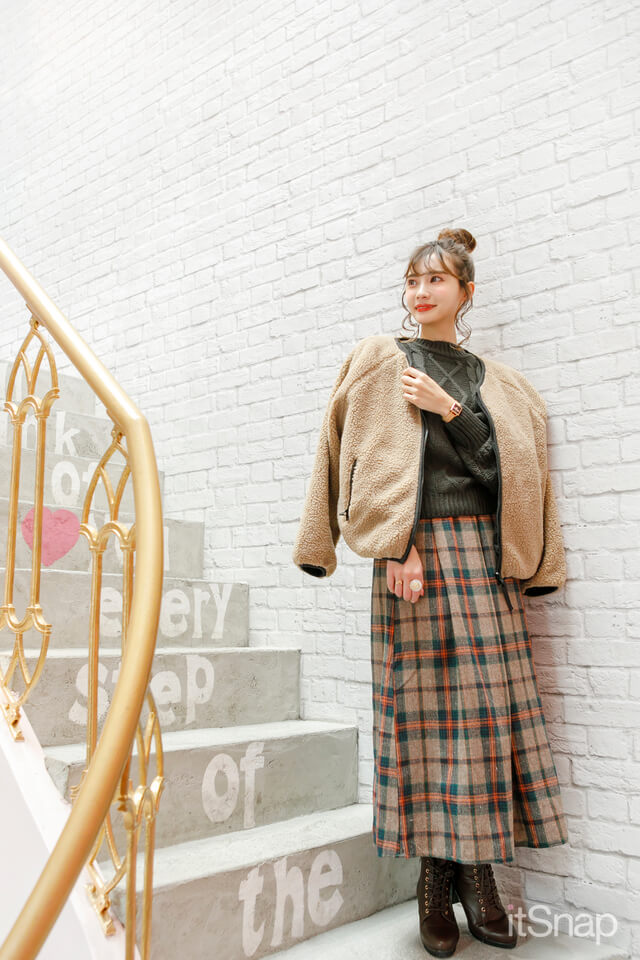 肩かけしたベージュのINGNIのボアブルゾンはリバーシブルでも使える優秀アイテム! ボリュームのあるモコモコとしたボアが暖かな印象を与えてくれてgoodです♪ 今期トレンドのチェック柄は落ち着いた色味のロングスカートで取り入れつつ、全体のトーンをアースカラーで統一することで、ほっこり可愛いレトロな着こなしが完成♡