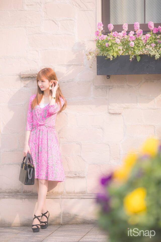 鮮やかなピンクワンピースのお目立ちスタイル。全身ピンクなのにどこか上品な秘密は、柄を引き立てるグレーのベースカラー。派手になりすぎず、落ち着いた印象に仕上がります♡ また、ウエストのリボンデザインもプラスされ、とことん女の子らしさ全開のコーデに。