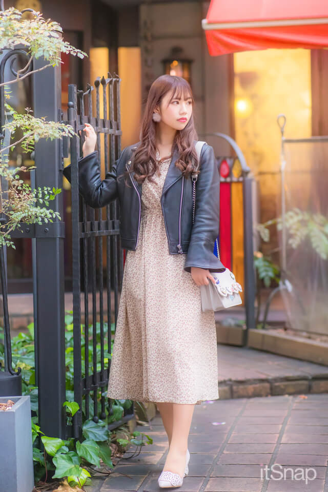 優しげなベージュとかわいい小花柄がレトロな印象のワンピースに、ブラックのライダースをON! ワンピースの甘さとエッジィなライダースのバランスが、ちょうどいい甘辛MIXになります♪ 女の子らしさはキープしたいので、小物はフェミニンにするのがポイントです♡
