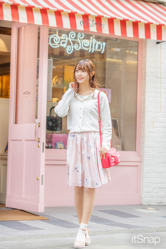 トップス、スカート、小物をすべてピンクグラデ&ホワイトで統一してガーリー仕上げに♡ ニットカーディガンのインはレースのトップスをのぞかせてかわいさをより強調。主役の花柄スカートは、淡いピンクと優しいタッチの花柄で春らしさ満点。実はパンプスのソールにも花柄刺しゅうが♡ 小物までこだわり抜いた計算づくコーデ。