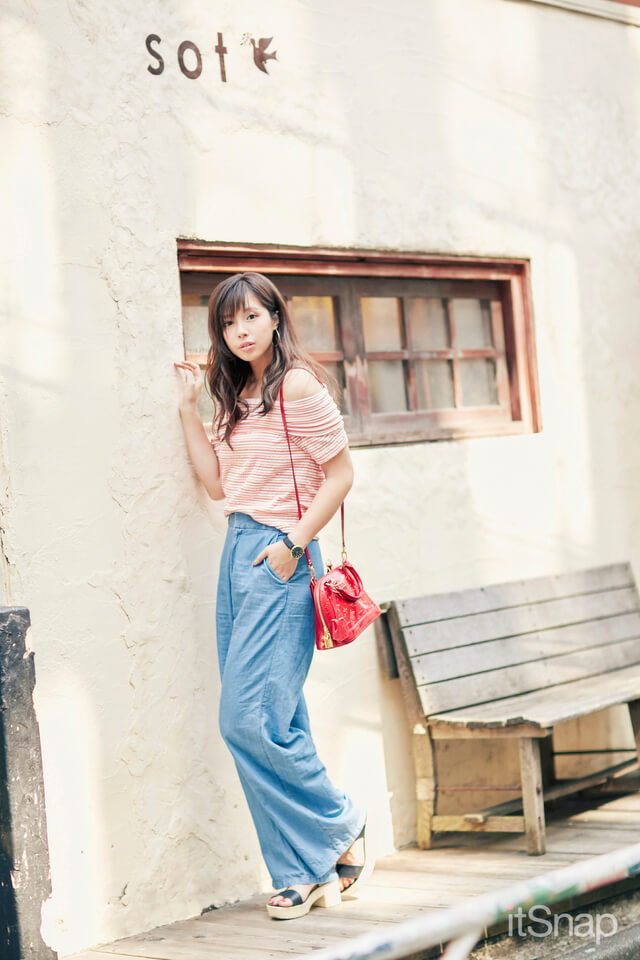 GUで約¥1,500だった赤×白のボーダートップスは、秋冬もまだまだ注目のオフショルをチョイス♡ こちらも注目のワイドデニムを合わせれば、ますますトレンド感がアップ。ちら見せした肩が、抜け感を与えてくれます。