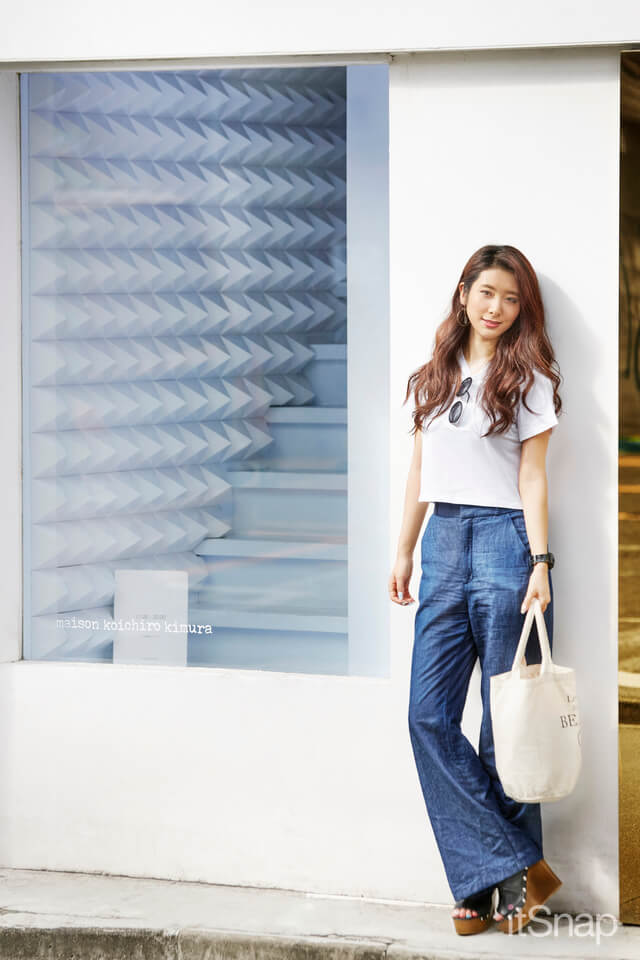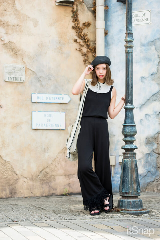 すそがフリンジになったオールインワンで、ゆったりした楽チンスタイル。インナーにしたGUの白のノースリトップスは、シンプルだけどハイネックのデザインが今年風。ベレー帽やフリンジバッグで季節感をプラス!
