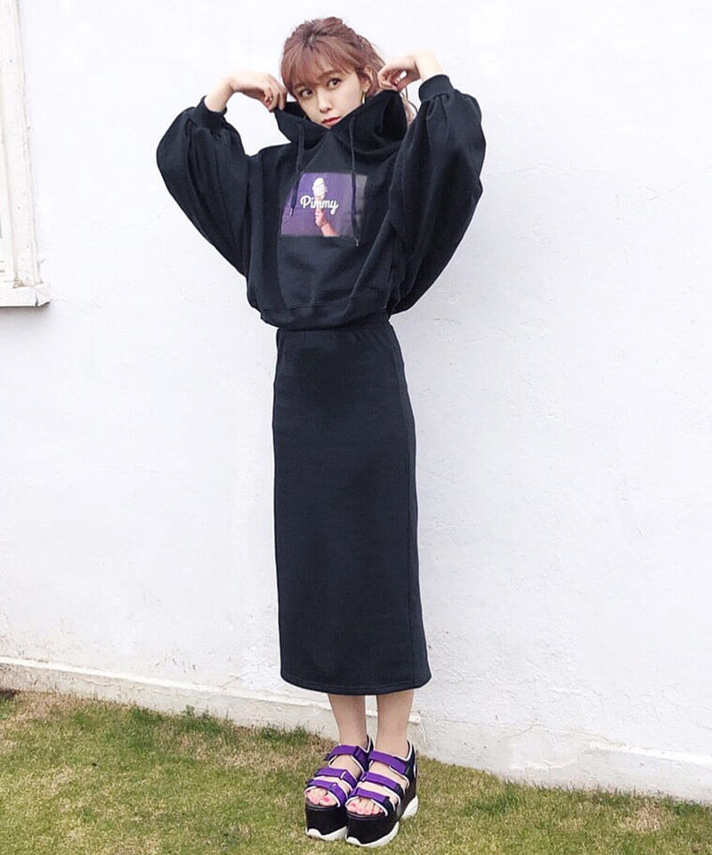 タイトなシルエットのデザインで、合わせるトップスを選ばずコーデを一気にトレンド顔にしてくれるミディ丈スカート。スウェット素材なので、ストリート感も残しつつ大人っぽい着こなしに♪