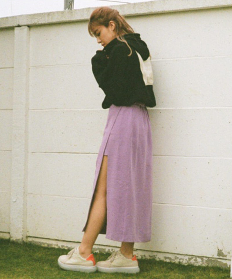 ロングタイプのラップスカートにざっくりと大きくスリットがIN♡ 歩く度にちらっと脚がのぞき、1つのコーデでも違った印象を見せてくれます。パープルの他ブラックのカラー展開。