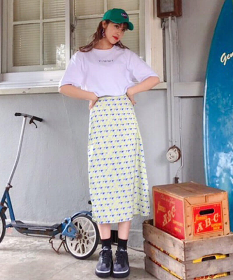 ポップなデザインのプリントスカート。総柄が普段の着こなしをおしゃれ上級者コーデにアップグレードしてくれます。ミディ丈なのでカジュアルアイテムと合わせても子どもっぽくなりません。