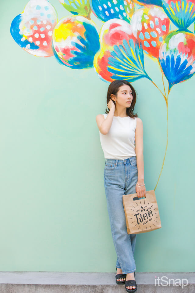 白トップス×ブルーデニムは永遠の定番♪ 麻素材のトートバッグに黒のラメサンダルでこなれ感をONして♡ カラフル風船のウォールアートともと相性抜群のコーデに!