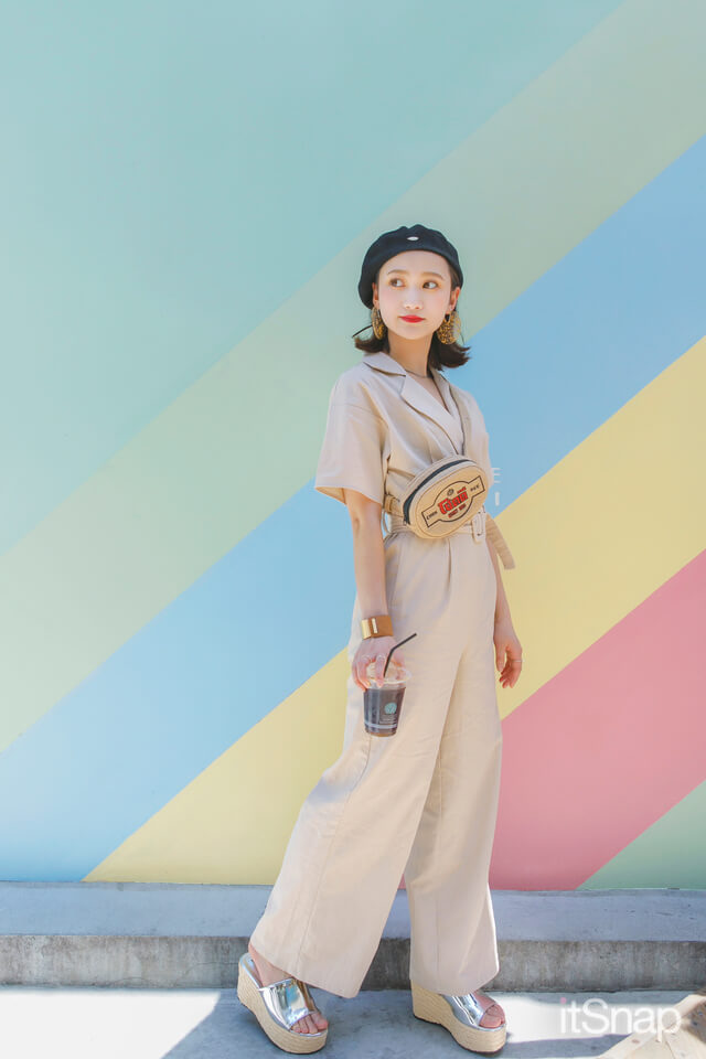 1枚で決まるベージュのオールインワンコーデ☆ ベレー帽にウエストポーチでこなれ感を出したほんのりストリートな着こなしが、レインボーの背景にマッチします♡