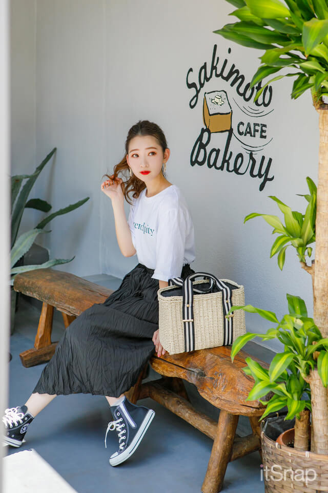 ロゴTシャツ×くしゅくしゅ素材のプリーツロングスカートで韓国風にまとめたコーデ♪ AKICHI(アキチ)内ウッドベンチに座れば、ナチュラルな魅力を高めてくれます♡