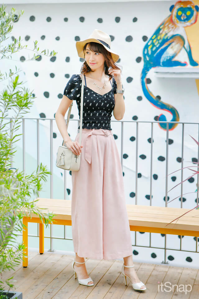 ベビーピンクのワイドパンツにクロップドトップスを合わせれば、夏のフェミニンコーデが完成♡ アニマルのウォールアートが、バカンス気分を高めてくれます♪