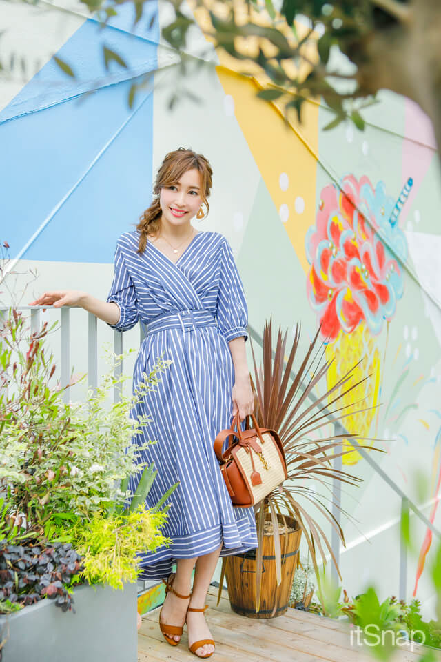 清涼感溢れるブルーストライプのワンピースに、ブラウン小物を合わせて大人な着こなしに♡ アイスクリームが描かれた壁を背景にして遊び心も取り入れて♪