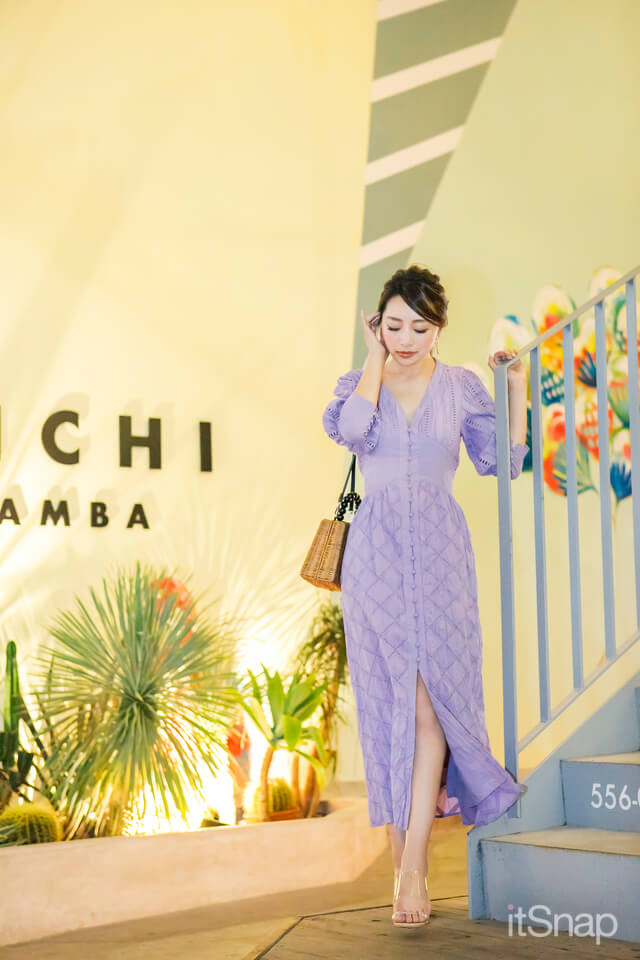 印象的なパープルのワンピースに、パステルイエローの背景がお似合い! かごバッグとクリアサンダルでヌケ感を演出して大人の余裕を♡