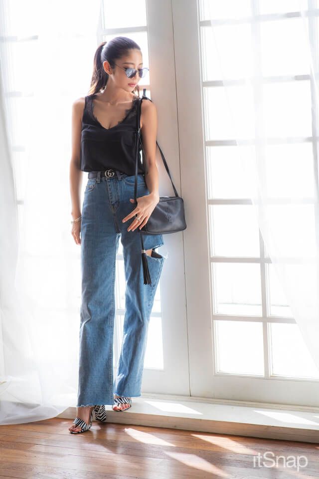 胸元のレースが色っぽいVネックトップスと、ざっくりカットされたダメージデニムがポイント♡ カジュアルながら、露出度高めで女っぽさもキープ。デニム以外をモノトーンで揃えれば、洗練された印象のこびない肌見せコーデに仕上がります!
