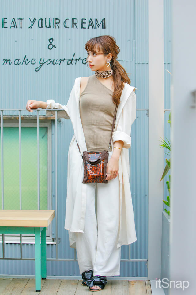 トレンドのワンショルは難易度高めのアイテムですが、羽織りでバランス調整すれば問題なし! ヌーディーになりすぎず、ヘルシーな印象に♡ 全体をホワイトとベージュでまとめて同色系のグラデーションをつくれば、統一感UP。