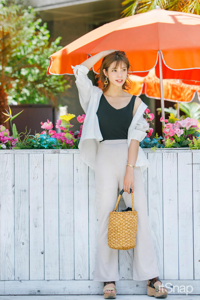 タンク×パンツに白シャツを羽織ったカジュアルスタイル。麦わら素材のバッグや、コルクソールのサンダルをプラスして、ちょいリゾート系のリラクシーなムードに♪ 麦わらバッグは、シンプルながら旬なバケット型でコーデのアクセント使いに◎。