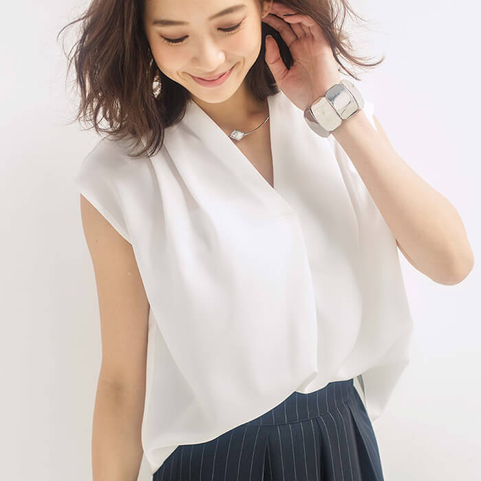 「タックデザインスキッパーブラウス」は、ほどよく品のあるとろみ素材でカジュアルにもキレイめスタイルにも馴染むからどんなシーンにも使えるデザイン。Vネックがデコルテをすっきりきれいに見せ、肩部分から入るタックが縦長ラインを強調してスッキリシルエットに♡ 胸元のふんわりとしたドレープがやさしく女性らしい雰囲気を演出してくれるので、デート服にも◎。