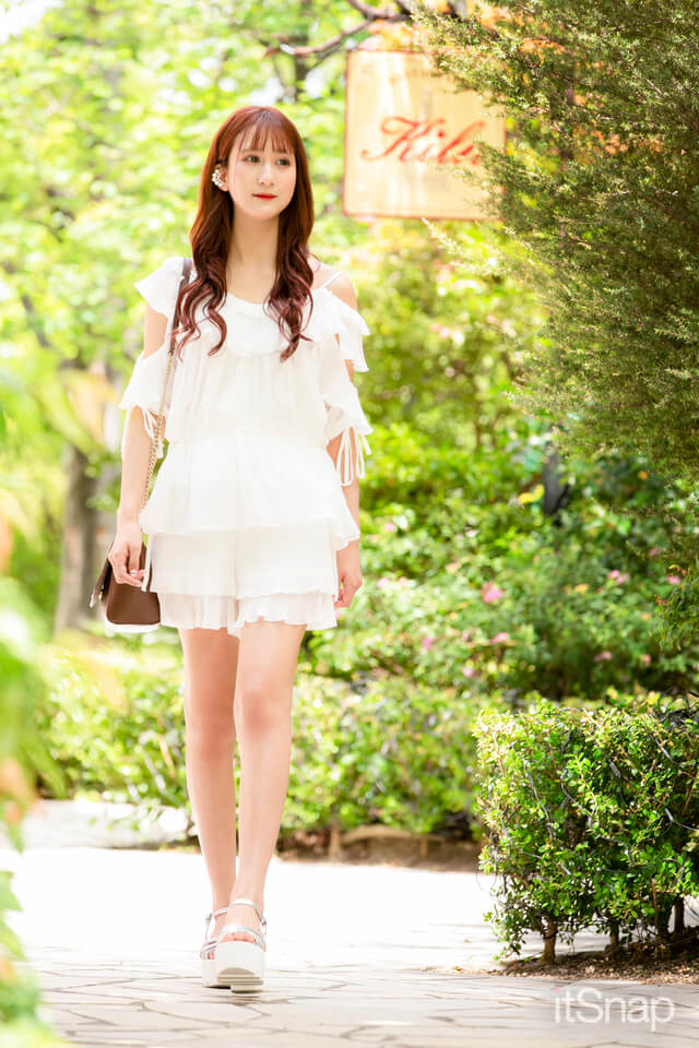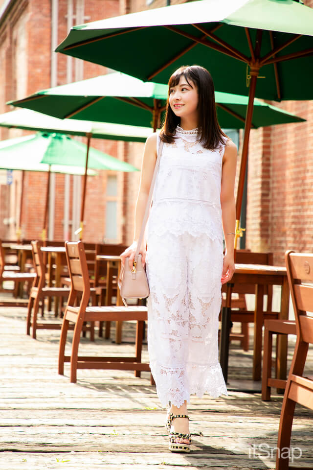 ホワイトレースで、大人らしさと可愛さどちらも感じられるセットアップ。レストランやカフェでの雰囲気とぴったりで、オトナの休日を楽しめそう♪