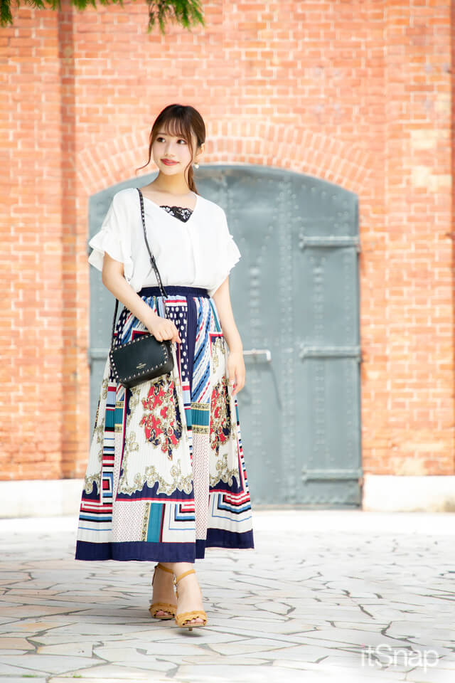 パッと華やかにしてくれるフルル袖ブラウスにエスニック柄ロングスカートのコーデで、異国感あふれるおしゃれな一枚に!