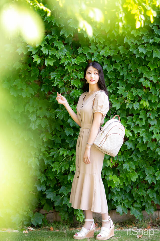 ベージュのワンピースとリュックで、お散歩デートにぴったりなコーディネート。緑の壁の前で撮ると、ナチュラルな魅力が倍増します☆
