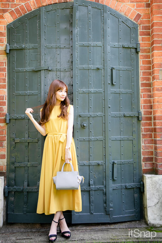 黄色の揺れるワンピースは、夏らしさたっぷり! レンガの雰囲気や、緑の森林など、どんな背景にもしっくりきます♪