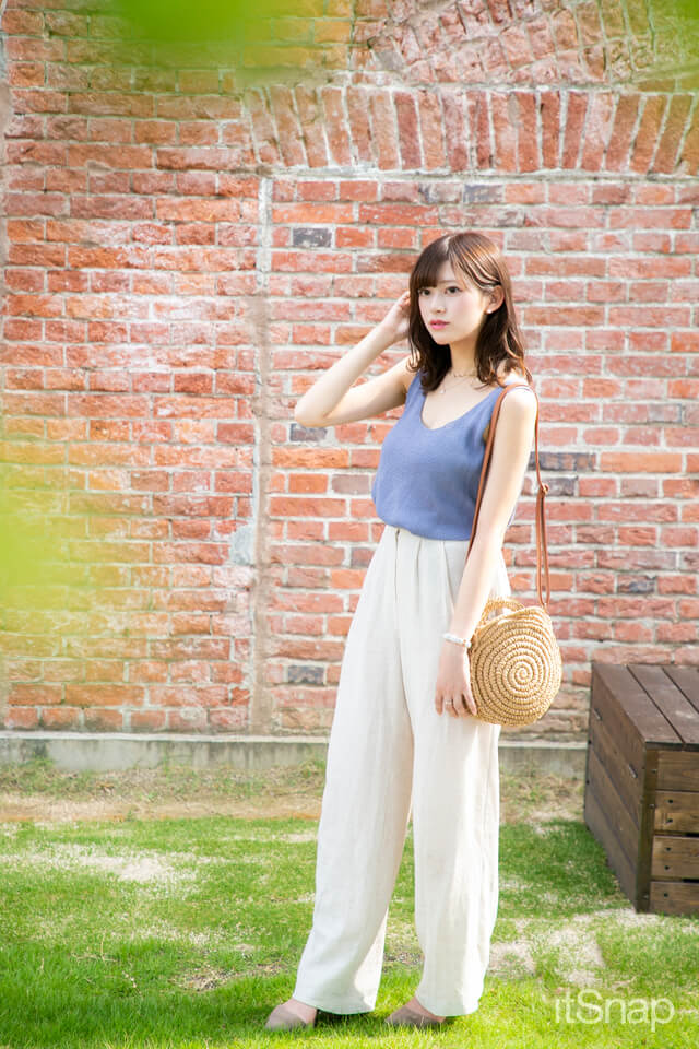 大きなつばのハットを取り入れたコーデは、まさに海外で過ごす休日のよう。ヨーロッパ調の背景とぴったりマッチします。