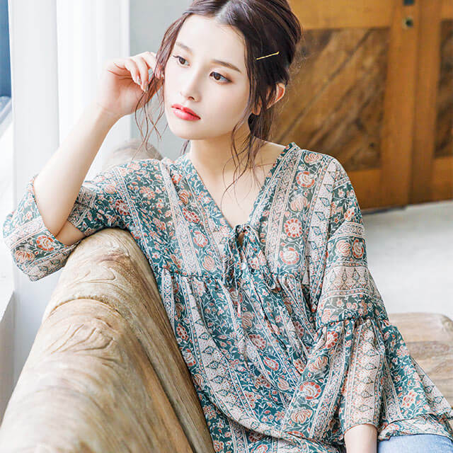 ふんわりとしたシアー生地を使用したブラウス。フレアスリーブで二の腕まわりを&Vネックで首元をすっきり見せられる嬉しいアイテム♡ ビンテージフラワーのプリントは、デニムやテーパードパンツ等、どんなボトムスにもよく合います。