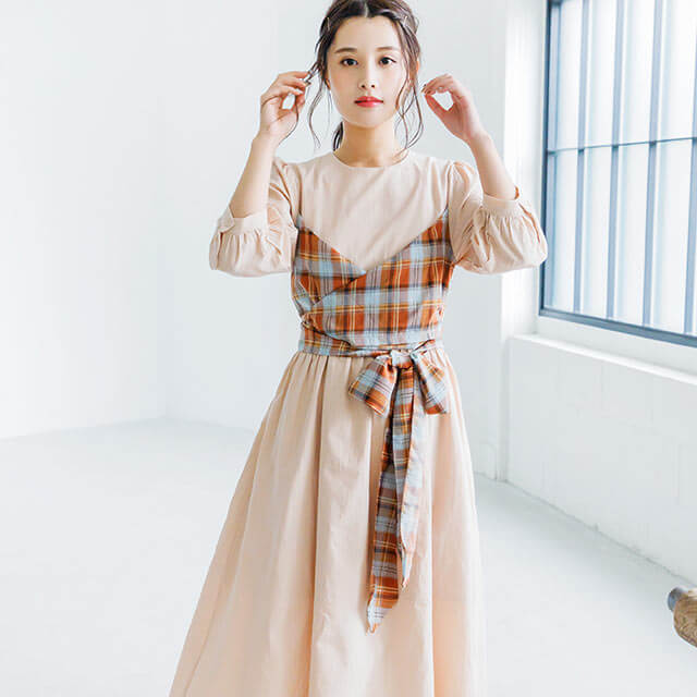 1枚でトレンド感のある雰囲気が楽しめるドッキングワンピース。柔らかい配色のチェックで、主張しすぎないのがポイント。ビスチェは結び目を調節できるので、どんな方でもメリハリのある着こなしに♪