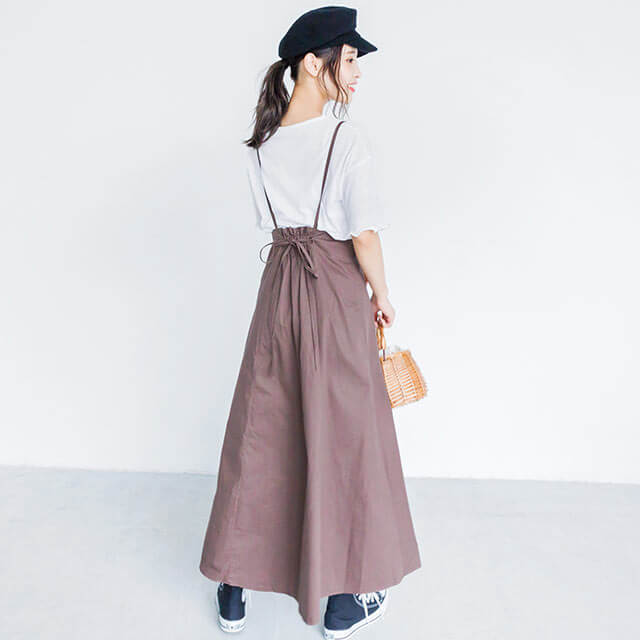 華奢なストラップで女性らしく、大人っぽい着こなしを叶えるシンプルなフレアスカート。ストラップは調節可能で、バックウエストのシャーリングゴムは締め付け感が少なく着心地抜群! ハイウエストなので脚長効果も狙えます♡