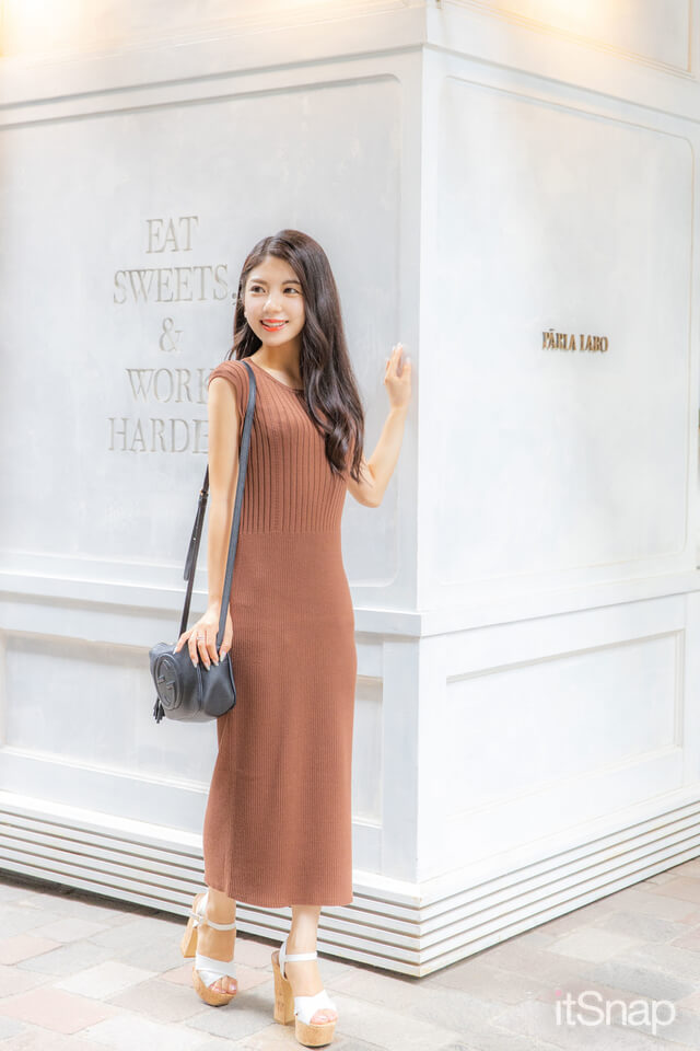体のラインをきれいに見せてくれるリブニットのロングワンピースは、これ一枚でサマになるラクチンなアイテム♪ タッセルがワンポイントのロングショルダーバッグを合わせれば、縦長効果でスタイルUPが叶うコーディネートに!