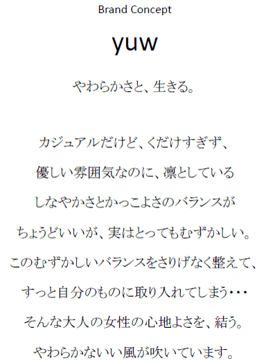 女性らしく、大人らしく、自分らしく…。な型通りの“らしさ”の枠をすがすがしく塗りかえて、新しいらしさの世界を自由に飛び回る女性へ向けた「yuw」。