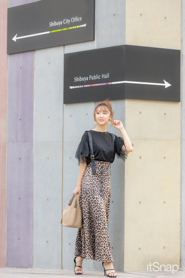 ヒョウ柄スカートを主役にしたトレンドライクコーデ。上品なミモレ丈と、ふわっと広がるフレアなシルエットが、強めな印象のヒョウ柄にかわいげをプラスしてくれます♡ ピアスもヒョウ柄で、小物までトーンを揃えて、統一感のあるコーデが完成!