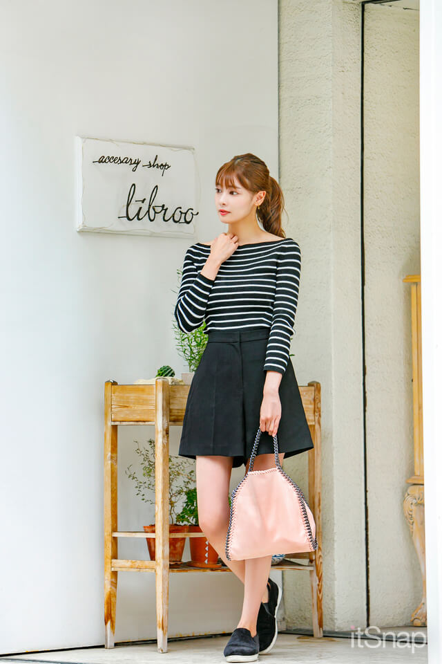オフショルのボーダーニット×Aラインショートパンツの肌見せで、モノトーンコーデにほんのり女っぽさをプラス♡ 足元は秋冬に大活躍しそうなもこもこスリッポンを合わせれば、季節感だけじゃなくこなれた印象も追加できます♡