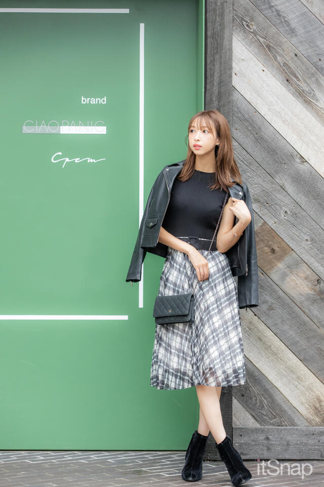 ノースリニットとシフォンプリーツの切り替えワンピは、色合いがシックだから可愛いのに甘くなりすぎない優れもの! 小物もブラックでまとめて、旬のライダースジャケットを羽織れば、甘辛バランスが絶妙なモノトーンコーデに♪