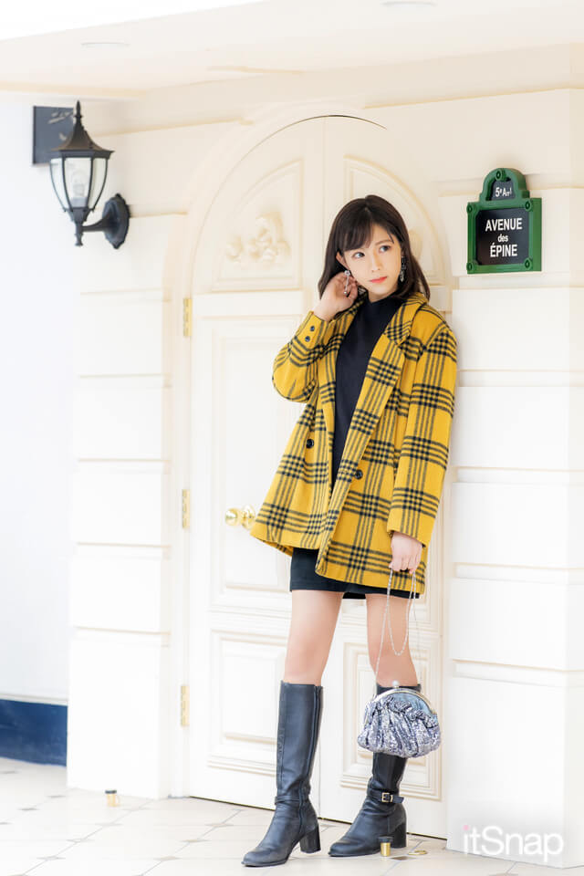 あたたかみのあるイエローとブラックのコントラストが引き立つよう、ジャケット以外は黒でまとめたスタイル。メンズライクなビッグシルエットだからこそ、その分脚見せして女の子らしさを残すのが、おしゃれ上級者ポイントなんです☆
