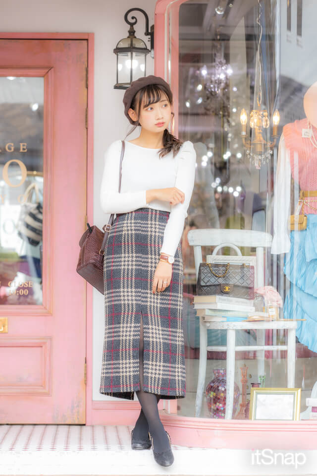 タータンチェックのスカートは、ロング丈でもスリットが入っているおかげで抜け感のある着こなしができる優秀アイテム♪ ベレー帽とクロコダイルレザーのミニリュックを全体のカラーや雰囲気と合わせれば、大人可愛いコーデの完成です!