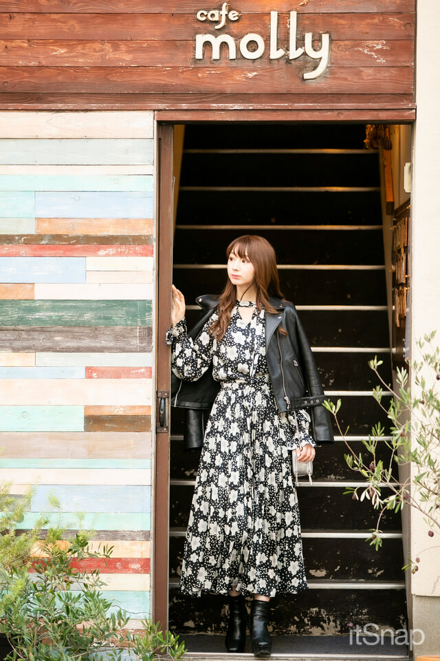 モノトーンコーデながら、女っぽいディテールの花柄ワンピでデート仕様に♡ ウエストマークでふんわりと広がるシルエットは、脚長に見えるところも魅力です。デコルテ&足元から肌をちら見せして、ヌケ感もプラス。