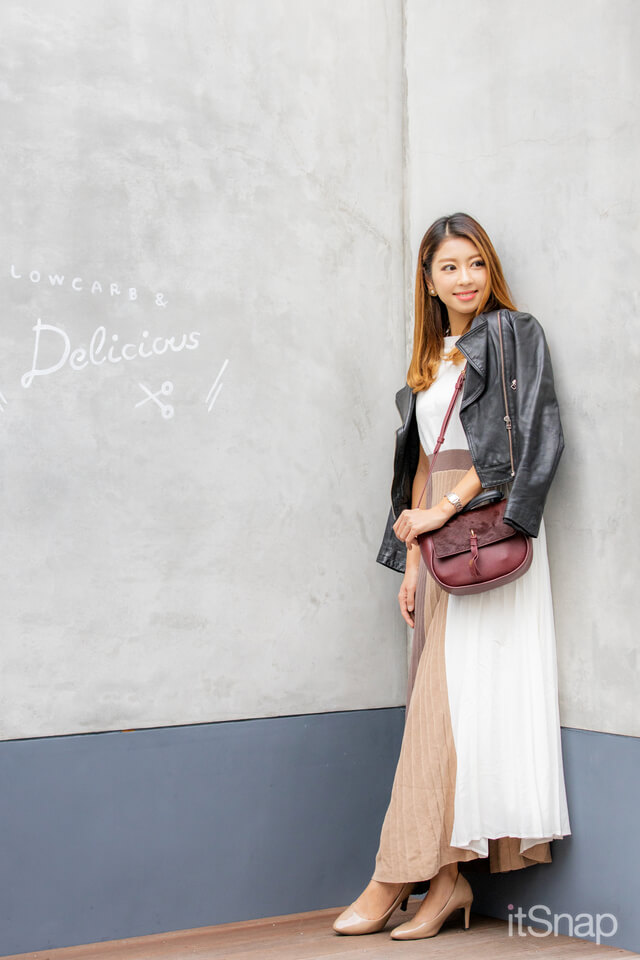 白×ベージュの旬配色がポイントのプリーツニットワンピース。この季節にぴったりなニット生地ですが、白プリーツ部分だけ素材が違うMIX感がおしゃれな一枚。ライダースを肩掛けしてこなれた印象を出せば、大人の余裕が漂うコーデの完成!