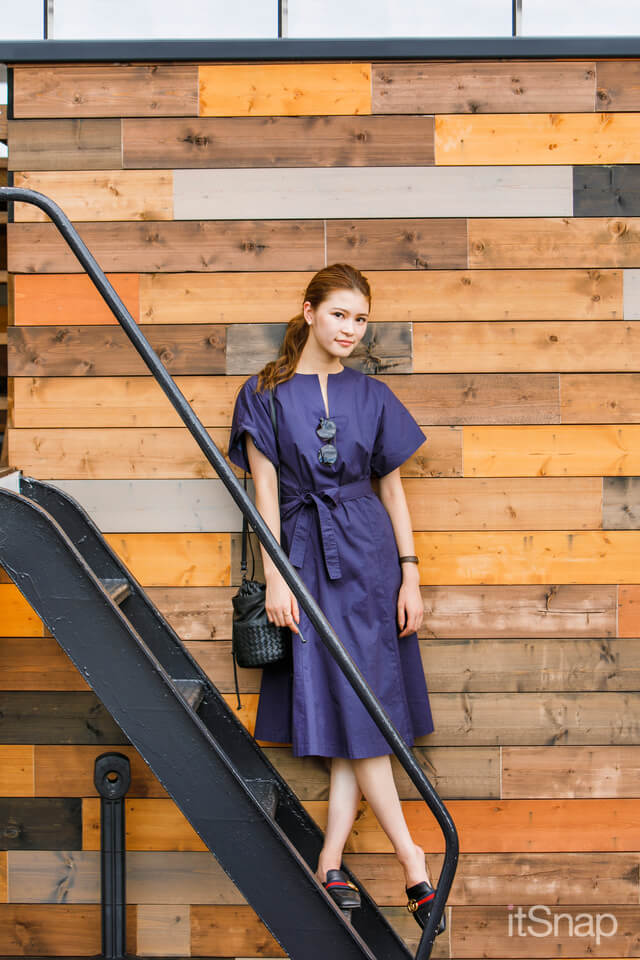 シンプルながら高級感の漂うネイビーワンピが主役のコーデ。