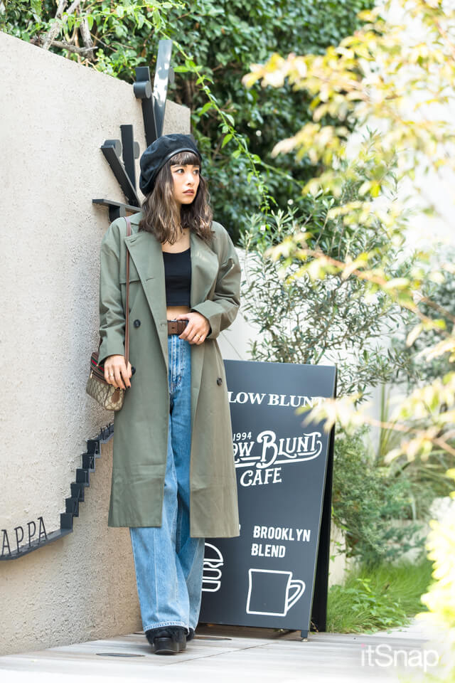視線を上に集めてくれるベレー帽とカーキのトレンチの縦長シルエットで