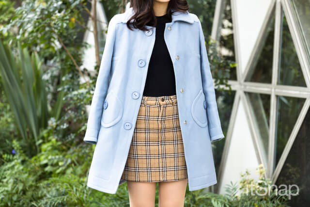 アイスブルーのコートを主役にバーバリーチェックのミニスカート、キャメルのレザーバッグと、ガーリーながら育ちの良さを感じさせるアイテムでまとめたのがポイントです。