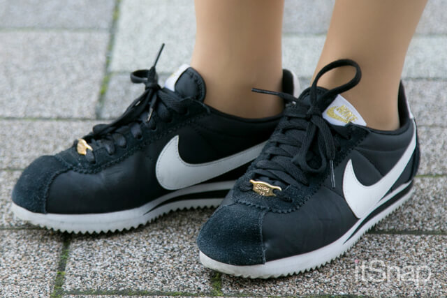 「Ron Hermanで買った合わせやすいネイビージャケットの中に、ホワイトニット(ENVYM)を合わせたスタイリング。このニットは腕とウエスト部分が黒のヒモでデザインされていて、そこがお気に入りのポイント。ボトムは韓国で買ったすそのフリルがキュートなスカートをIN♪ 足元はあえてスニーカー(NIKE)でハズしてカジュアルにしつつ、VALENTINOのスタッズ付きバッグでちょっぴり辛口にしました。足首を見せてヌケ感をつくったのもポイントなんです。」
