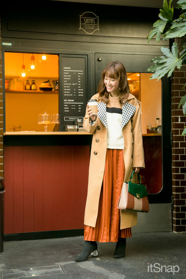「エリ部分のギンガムチェックがとってもお気に入りのトレンチコート(&.NOSTALGIA)と、光沢のあるグロッシーな生地が◎なプリーツパンツ(MURUA)で女性らしい着こなしを意識しました♪ ベージュ、黒、白の配色が可愛いニットトップスは韓国ファションを一気にチェックできるECサイト” NOWiSTYLE”で購入。メタリックのヒールがポイントのショートブーツもパンツと同じMURUA、グリーンが差し色になるカラーブロックのバッグはEVIRSのものです!」
